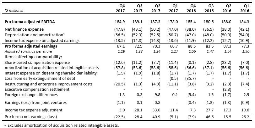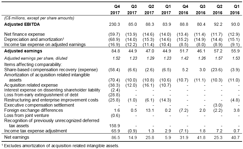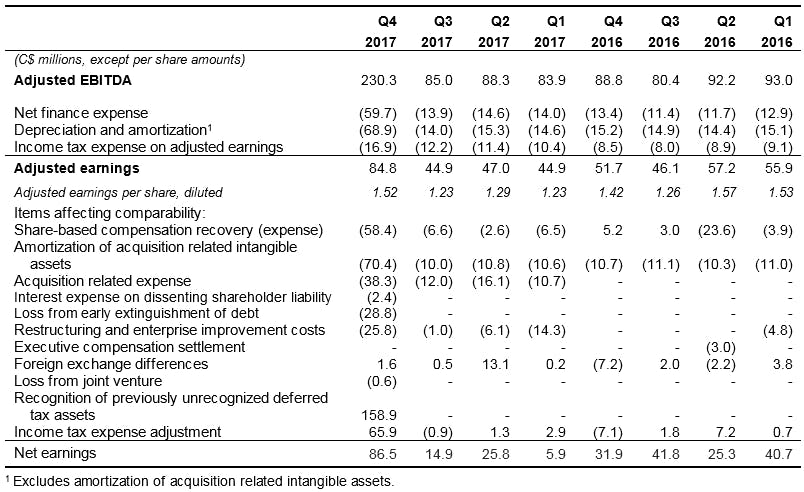 Le tableau suivant réconcilie le BAIIA ajusté et le bénéfice ajusté avec le bénéfice net en dollars canadiens pour les huit derniers trimestres, si la société avait continué à utiliser une monnaie de présentation en dollars canadiens pour l'année se terminant le 31 décembre 2017.