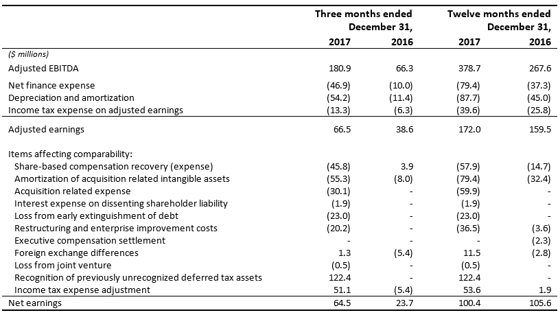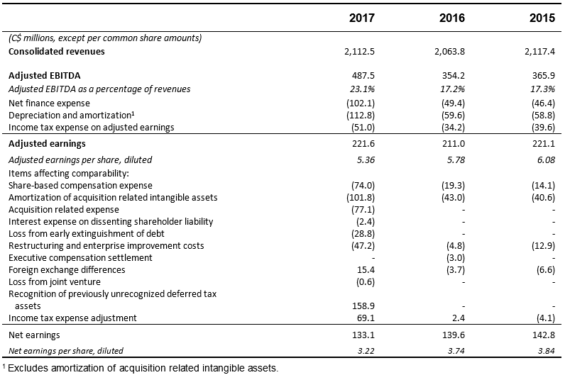 Le tableau suivant présente des renseignements financiers sélectionnés pour les exercices indiqués, y compris un rapprochement entre le BAIIA ajusté et le bénéfice ajusté et le bénéfice net, si la société avait continué à utiliser une monnaie de présentation en dollars canadiens pour l'exercice se terminant le 31 décembre 2017.