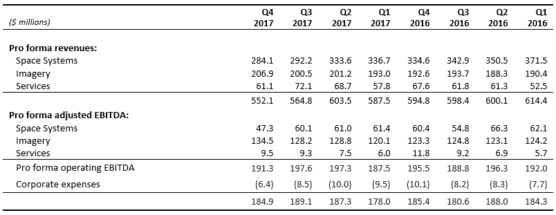Le tableau suivant résume les revenus pro forma et le BAIIA ajusté pro forma par secteur pour les huit derniers trimestres en dollars américains comme si Maxar et DigitalGlobe avaient été une seule société à partir de 2016.