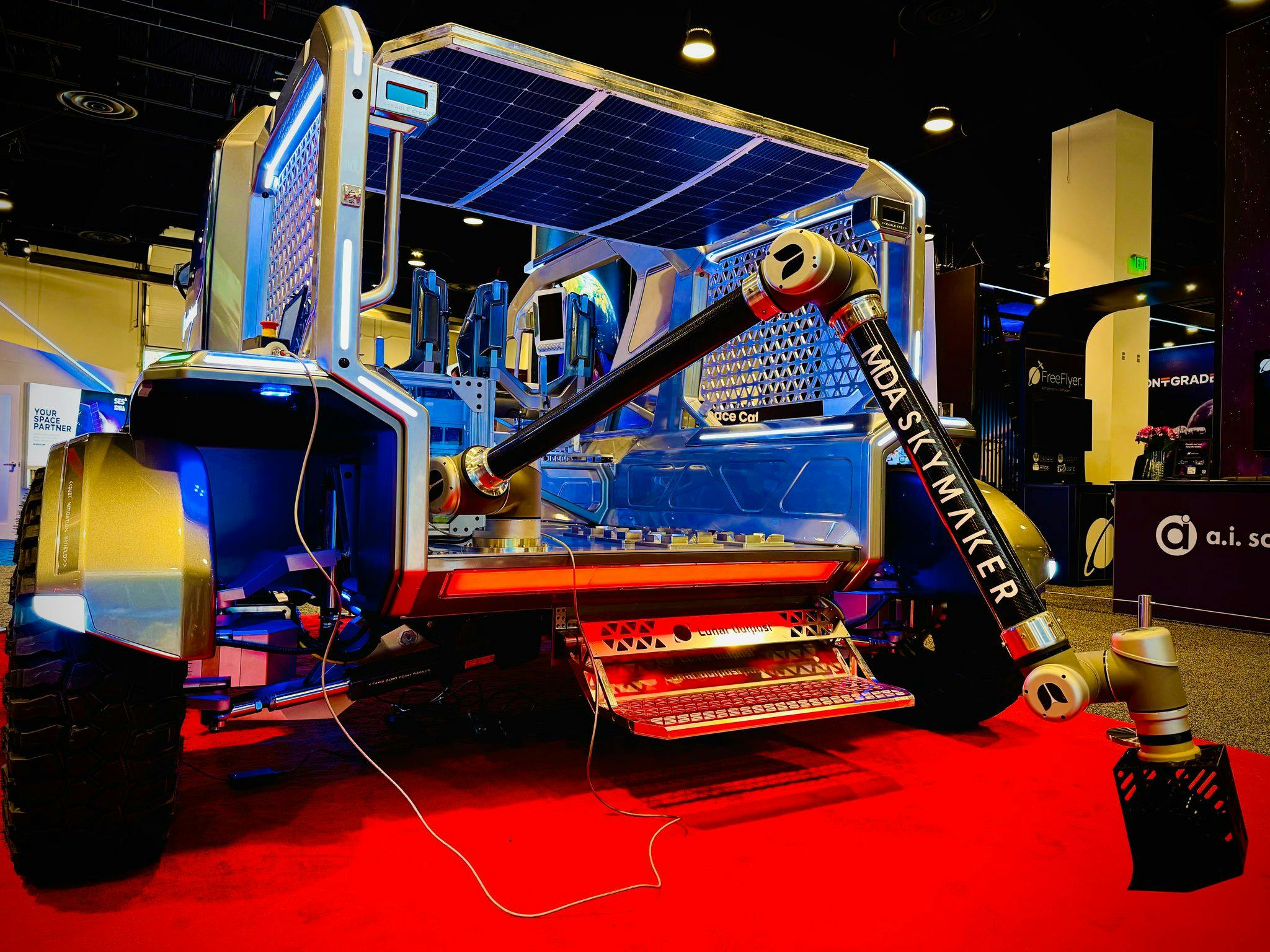Next, it was time to let MDA SKYMAKER™ shine on the Lunar Outpost Eagle rover at the annual Space Symposium in Colorado Springs, CO. Hosted at the MDA Space booth, this provided a next-level engagement with the space industry and sparked conversations around our space robotics and operations capabilities to support customers through cargo logistics, surface mobility, infrastructure construction and resource extraction and transport, helping to enable a sustainable and competitive space economy.